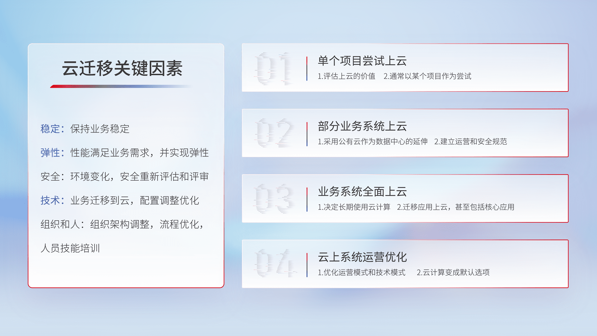 结合实际业务,,,从规划设计、、、云平台选型、、云原生改造、、、、数据迁移、、、、集成交付,,迁移全过程为客户识别最佳上云路径,,做好风险识别管理,,设计网络架构、、、、身份权限、、安全审计合规、、、操作审计、、、日志审计、、、、监控告警策略、、、、多站点容灾设计等,,,,对云上基础设施进行整体规划,,提升IT治理水平,,,,以满足弹性、、、高可用、、高性能的需求。。。