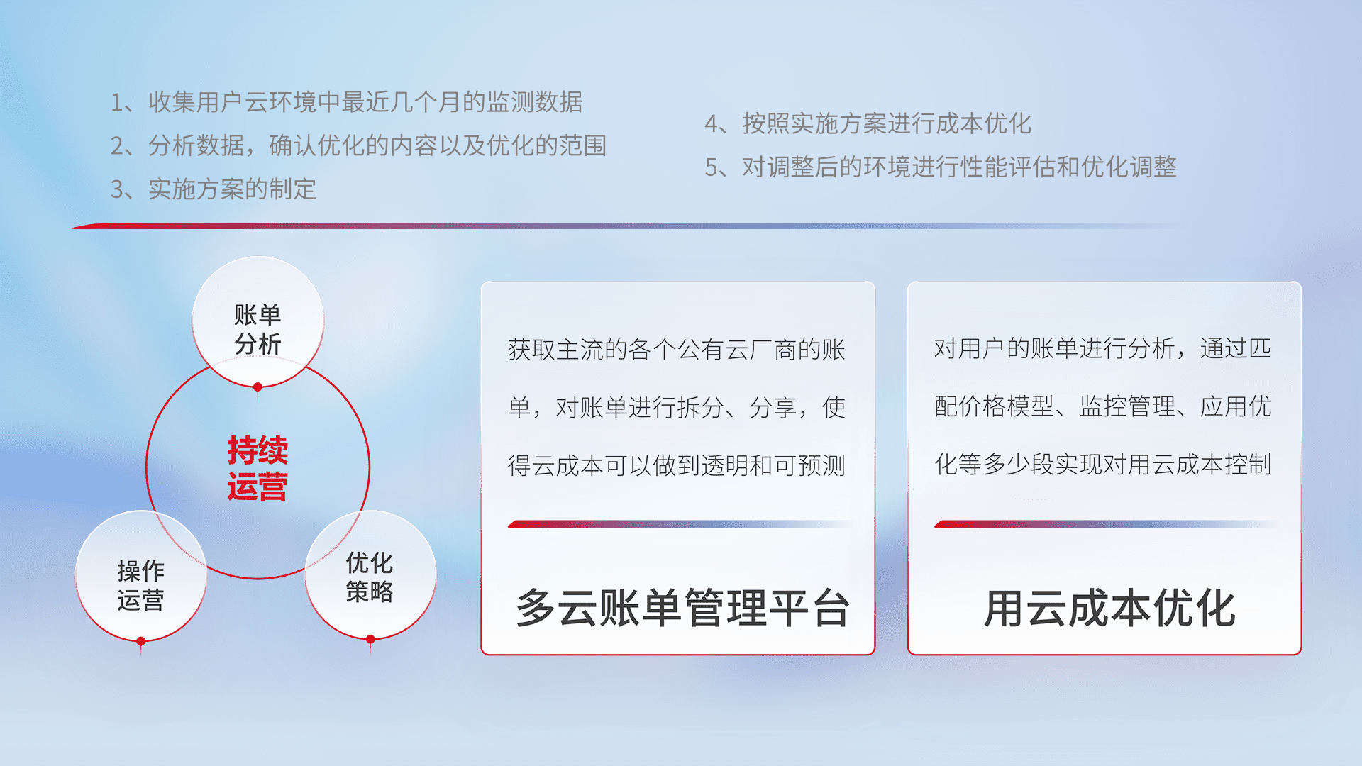 通过多云纳管,,以统一的资源数据模型把客户的云资源进行抽象和封装,,,进而实现对多云资源的统一操作,,,,保障云资源管理的可靠性、、、、稳定性与可用性。。量身定制化运维内容,,配置、、、、开发运维、、补丁管理、、、备份、、、、监控、、认证和访问管理、、、、审计和日常巡检等,,,,保障在用云过程中的可靠度,,,,稳定度以及高可用率。。。。